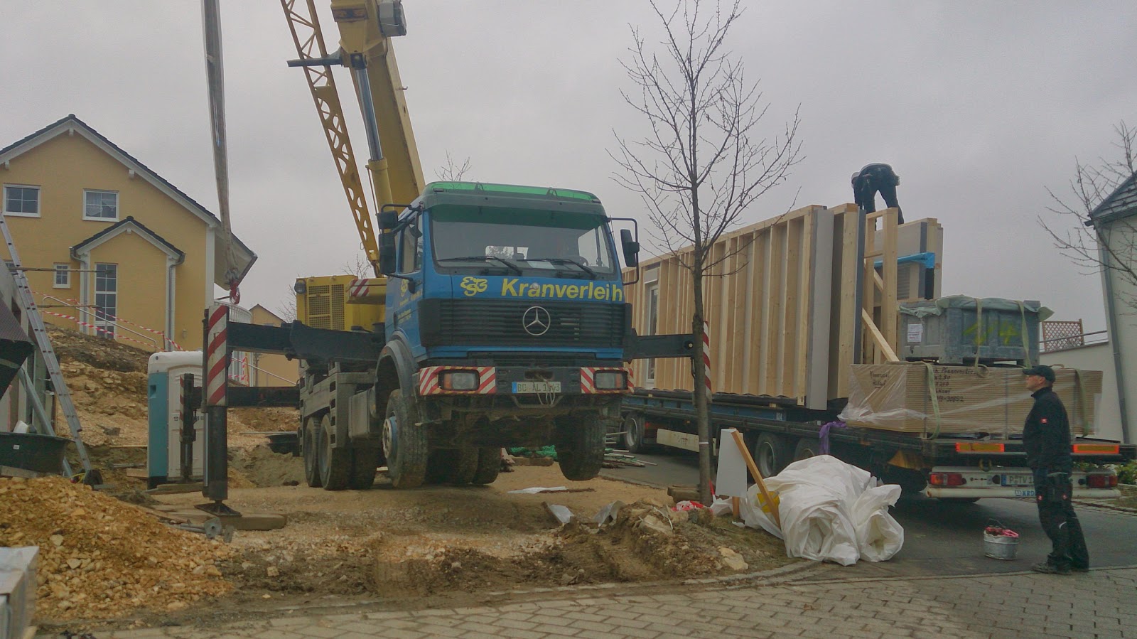 Es ging sofort los, Werkzeuge wurden kaum ausgepackt, da kam schon der Autokran und der erster LKW hinterher!!! Um 11 Uhr stand das Erdgeschoss und um 19 Uhr wurden die ersten Pfetten gesetzt.